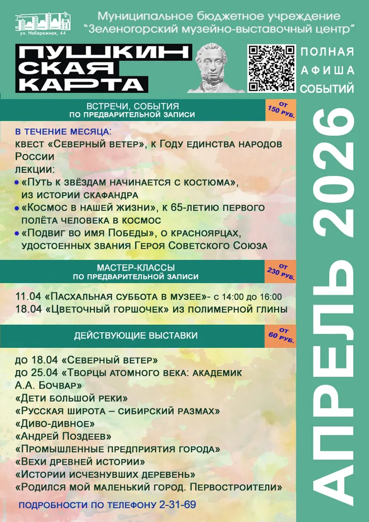 В апреле приглашаем держателей Пушкинских карт в Зеленогорский музейно-выставочный центр на выставки, квест, лекции, мастер-классы!
